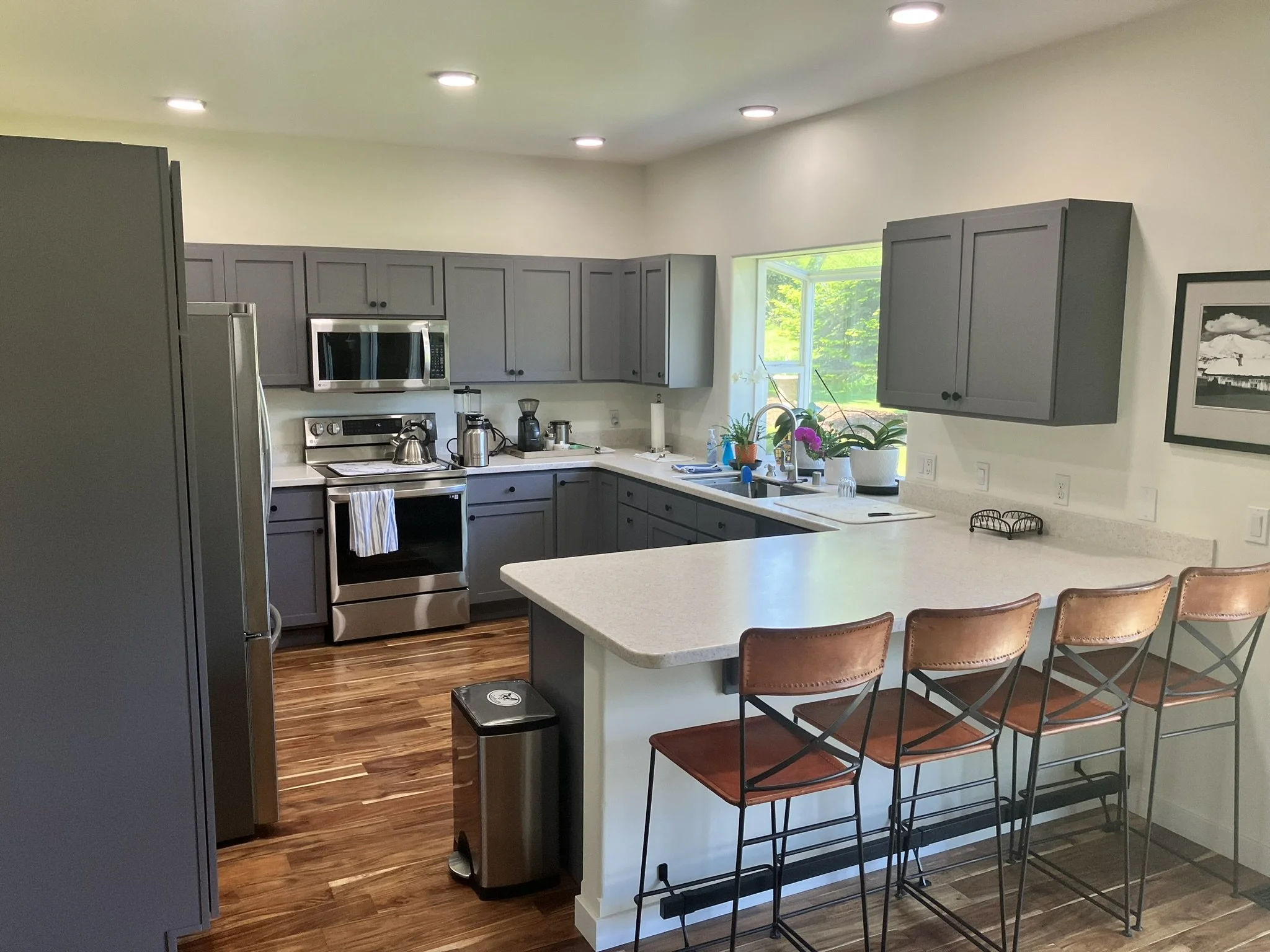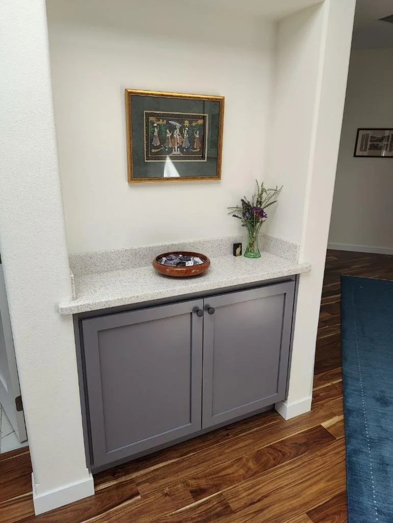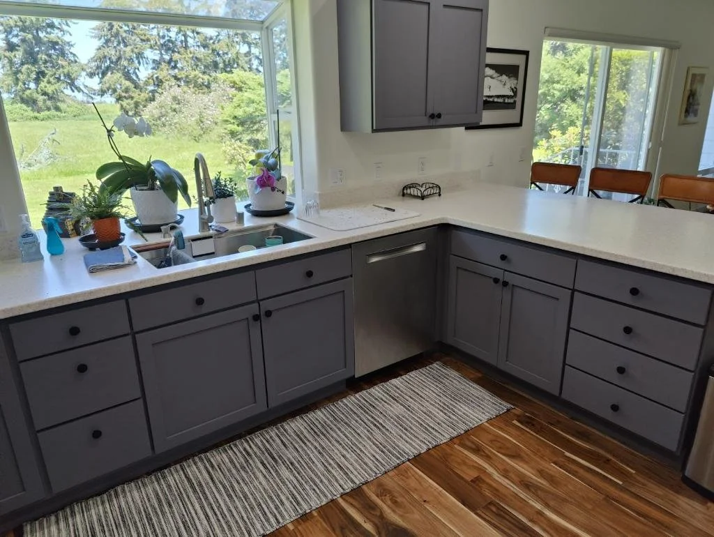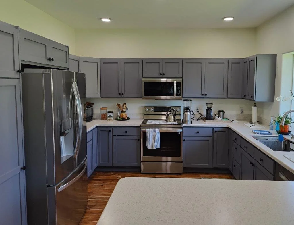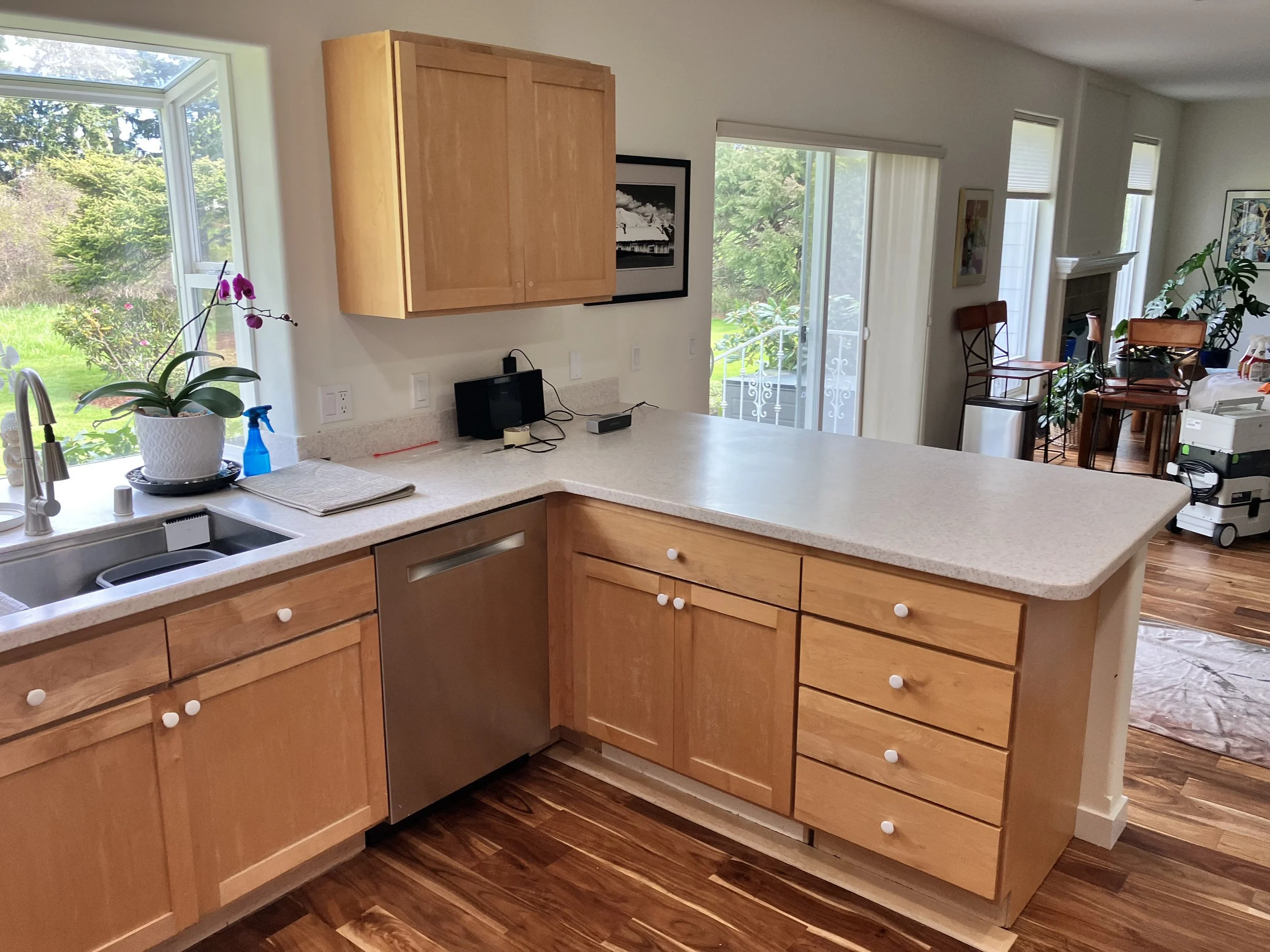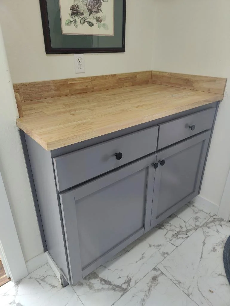 This project started out with cabinets that were in good condition but had a badly failed clear coat peeling off. After extensive sanding and fillings dings & scratches with Bondo, we finished with Renner 2k primer and paint.